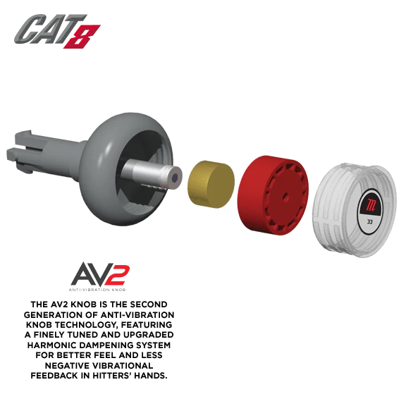 The CAT8 -8 is a USSSA certified, one-piece alloy bat built with AZ105 super strength aluminum alloy meaning thinner walls, higher response rate, and better durability. The precision-balanced barrel features a ring-free multi-variable wall design that creates an expanded sweet spot, while the patented AV2 Anti-Vibration knob produces a better feel and less negative feedback.