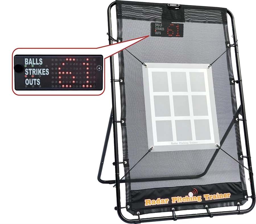 Varsity Radar Pitching Trainer is a one-of-a-kind new product that combines a pitching target with a sonic radar ball speed indicator and a virtual umpire for the ultimate pitching experience.